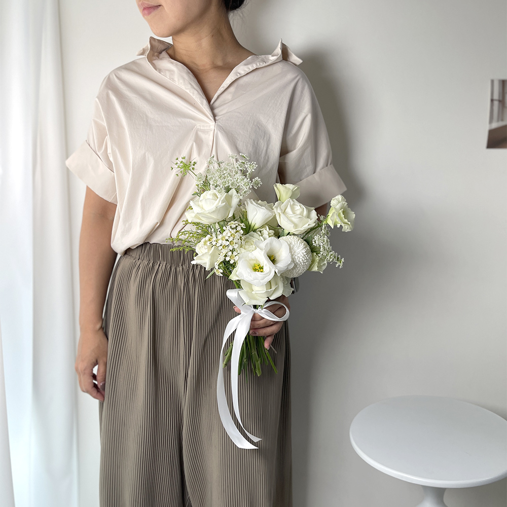 儘可能放置通風陰涼處,若於戶外拍照天氣較炎熱,需注意捧花保水,可準備一個便攜的花瓶,暫停拍攝時可讓捧花吃水,避免花朵失水過快。夏天高溫也可多準備純水溼紙巾覆蓋捧花表面。