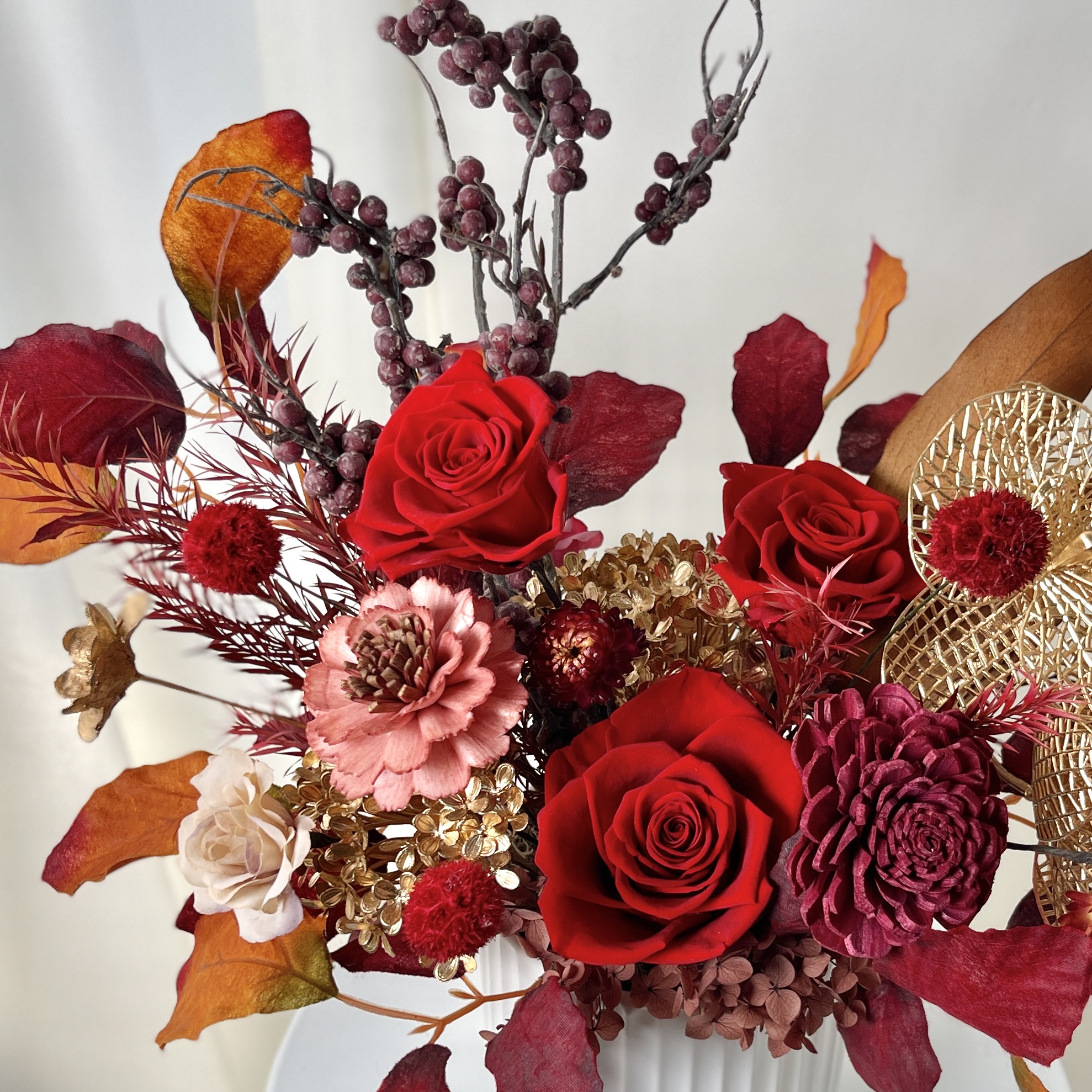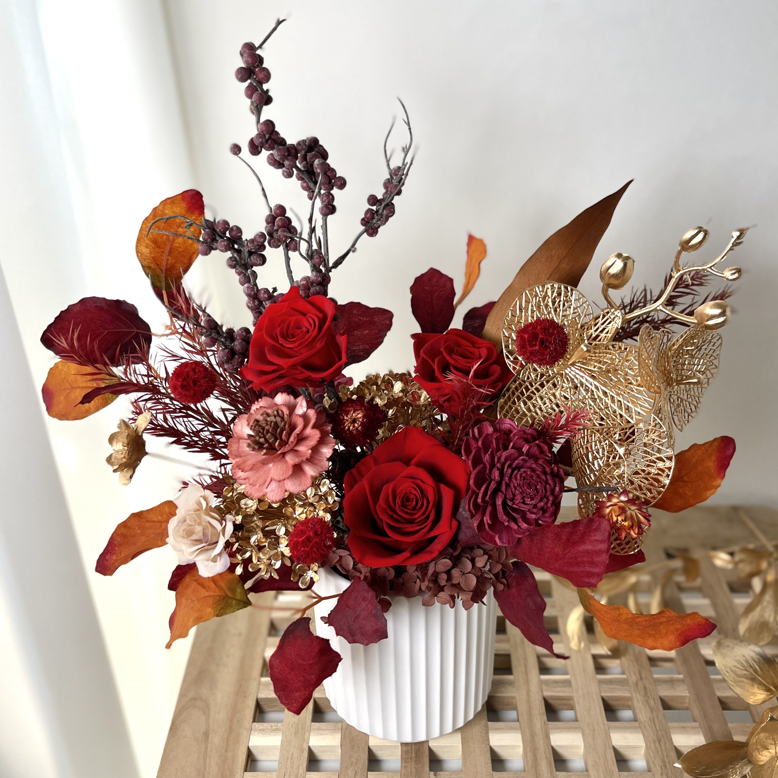 • 每批永生花的色彩染製皆會有些許落差,螢幕顯示或拍攝光源都會造成花藝作品的色差,若有非常在意的朋友,建議可直接來店選購。